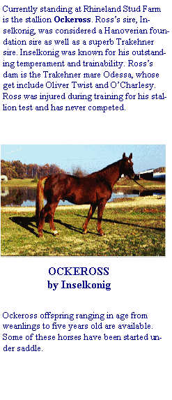Ockeross offspring combine the bloodlines of internationally acclaimed sire Inselkonig and award producing dam Odessa.